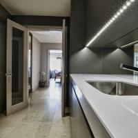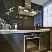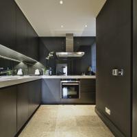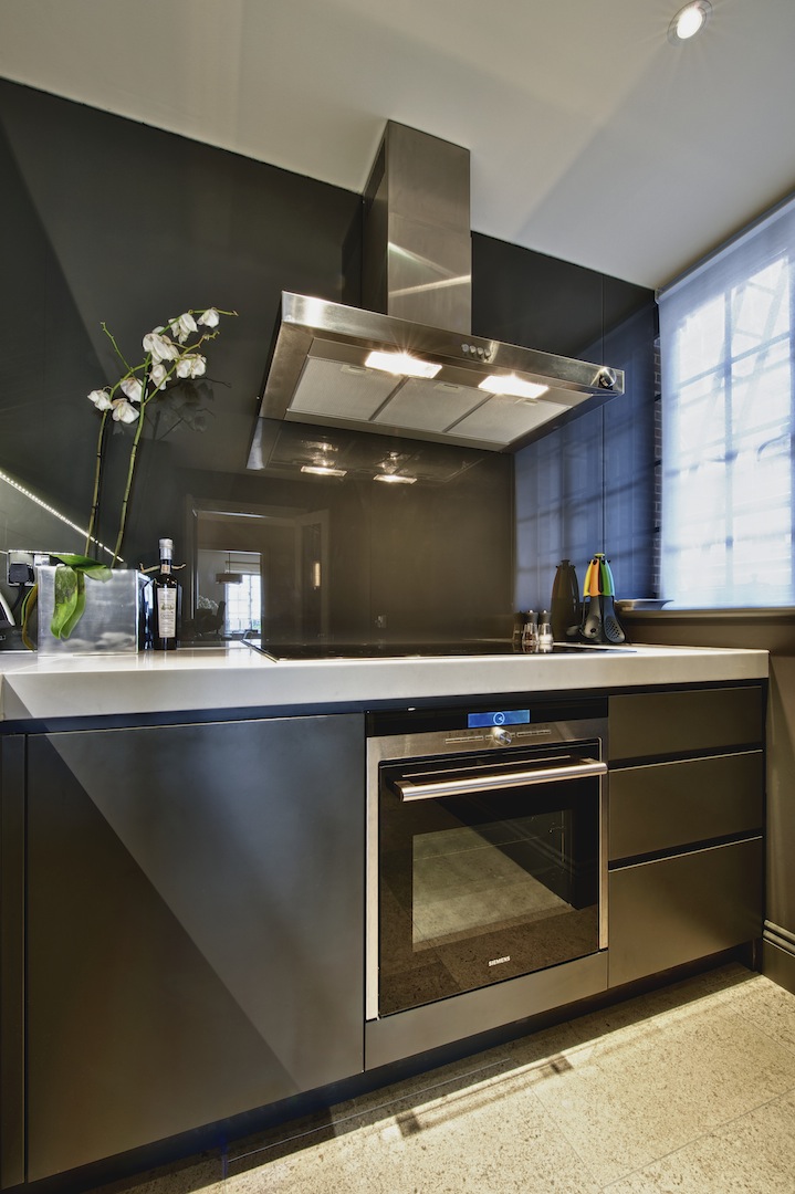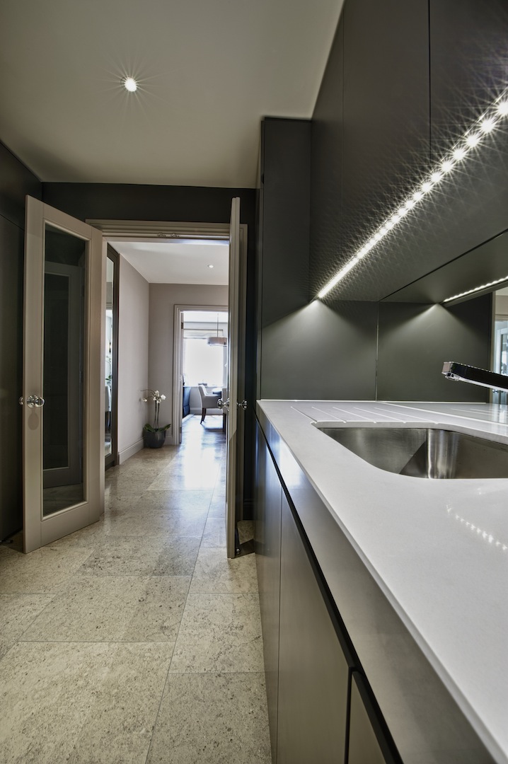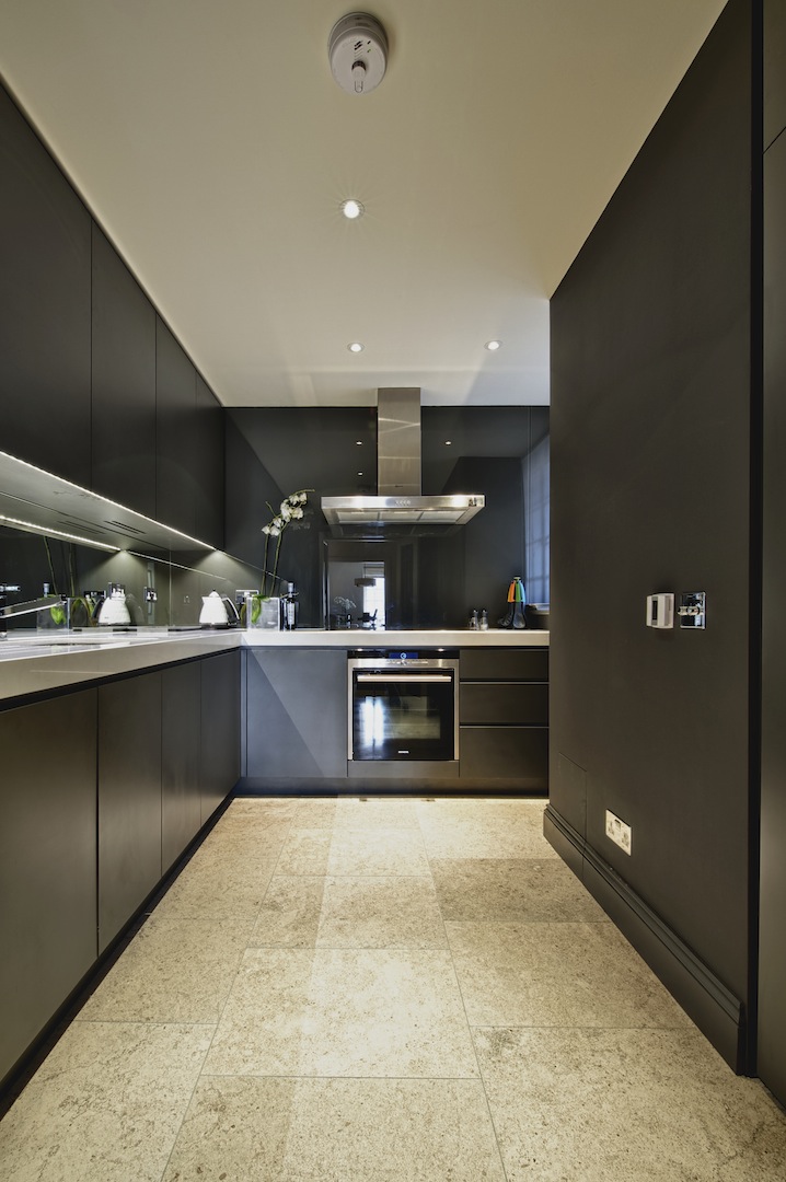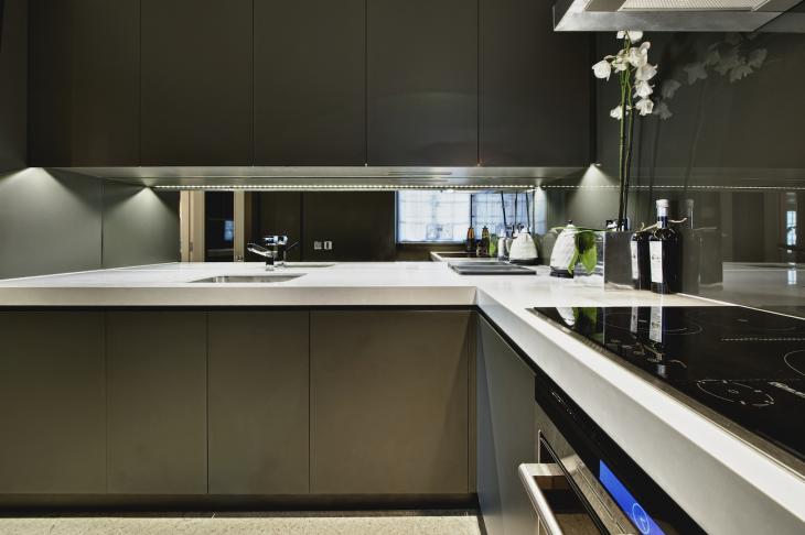 Interior and exterior in eggshell spray paint finish. Flat handleless doors with chamfered edges, under mounted s/s sink, Siemens integrated appliances and White Quartz composite stone worktop.