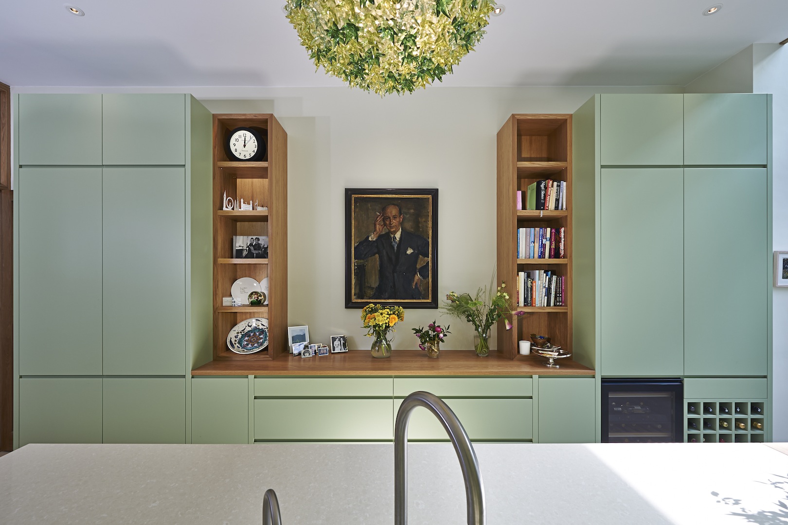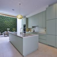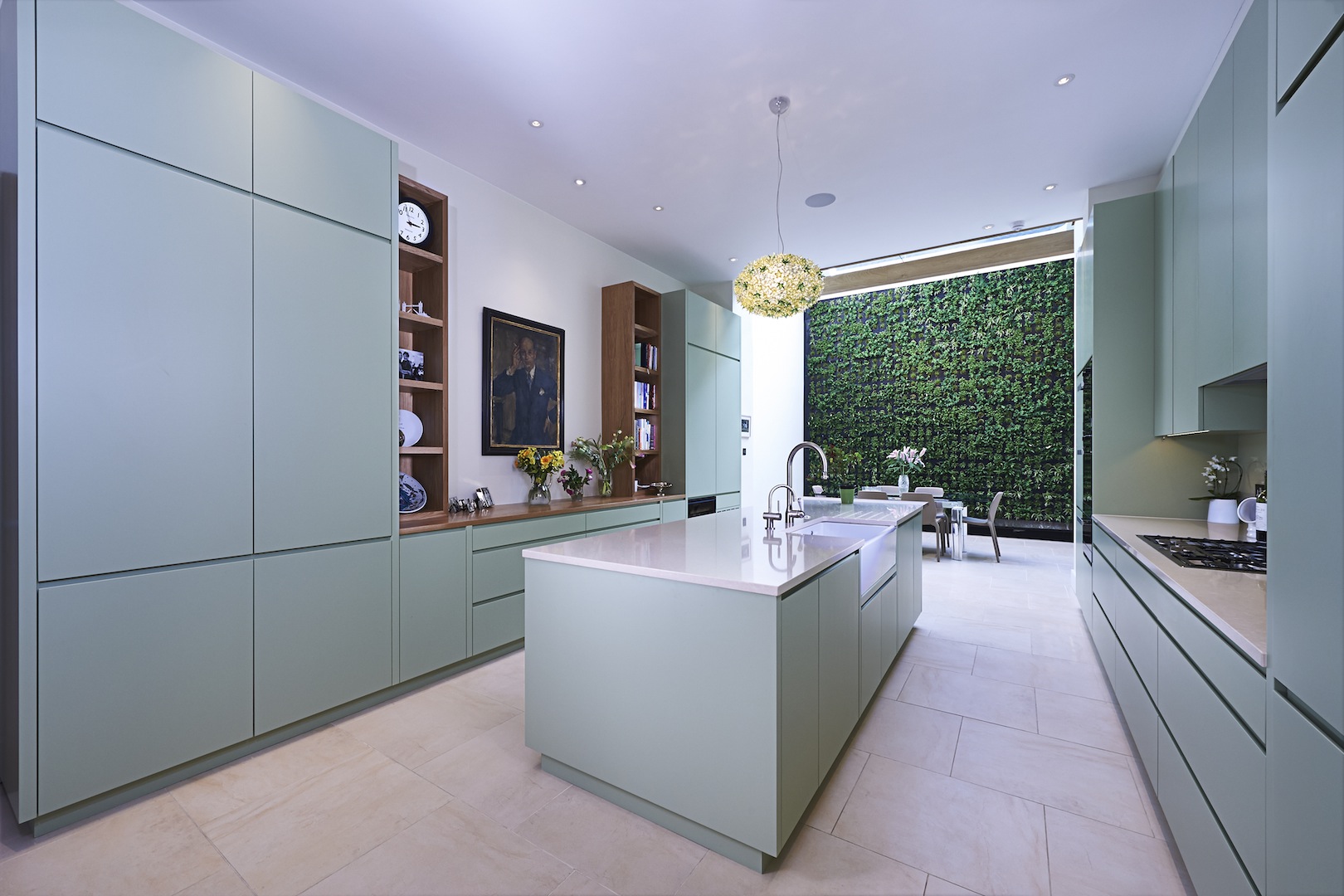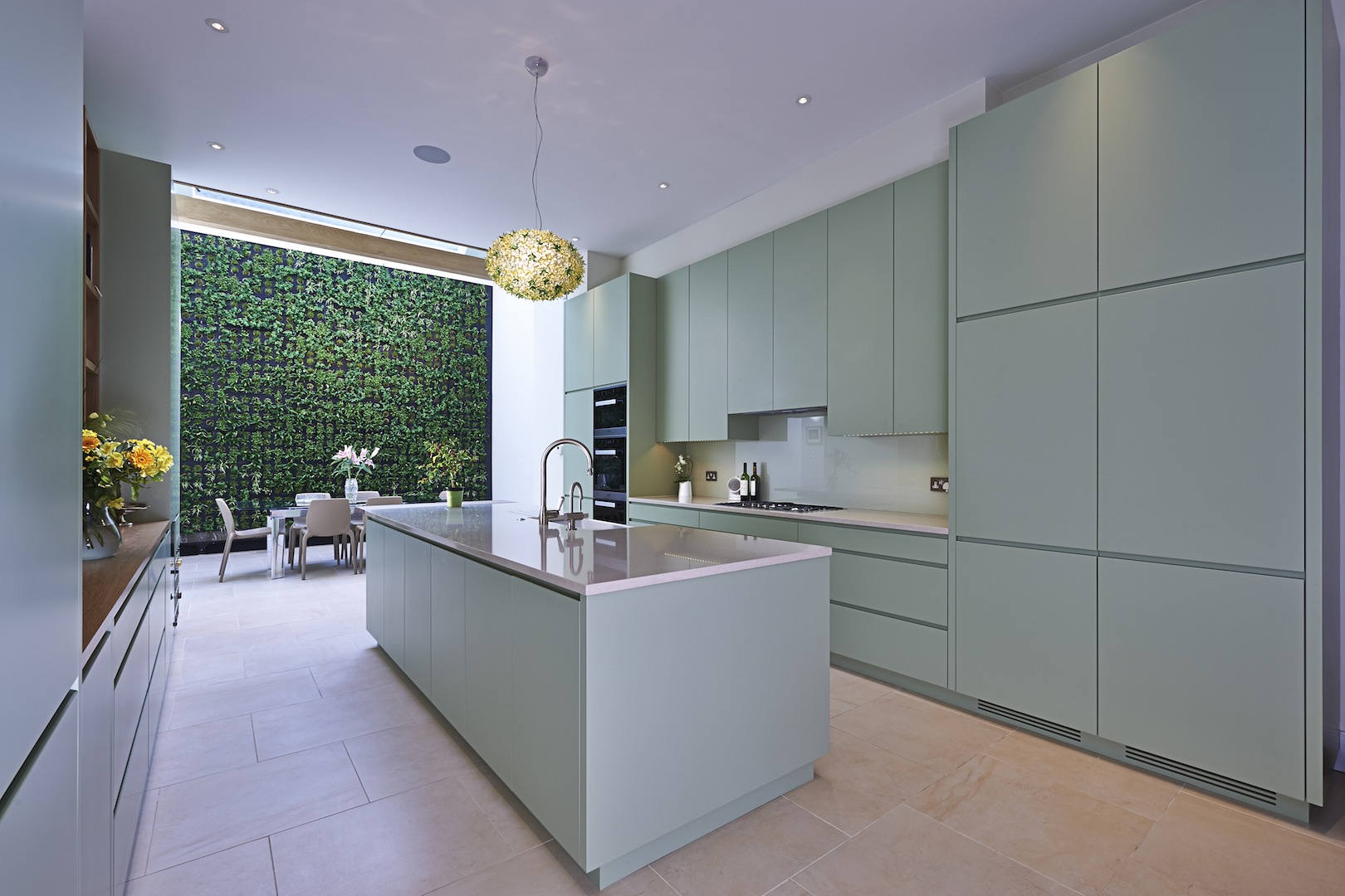Interior and exterior in eggshell spray paint finish. Flat handleless doors with chamfered edges, belfast sink, Miele integrated appliances and White Organic composite stone worktop.