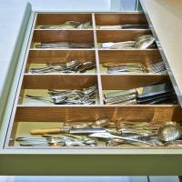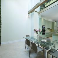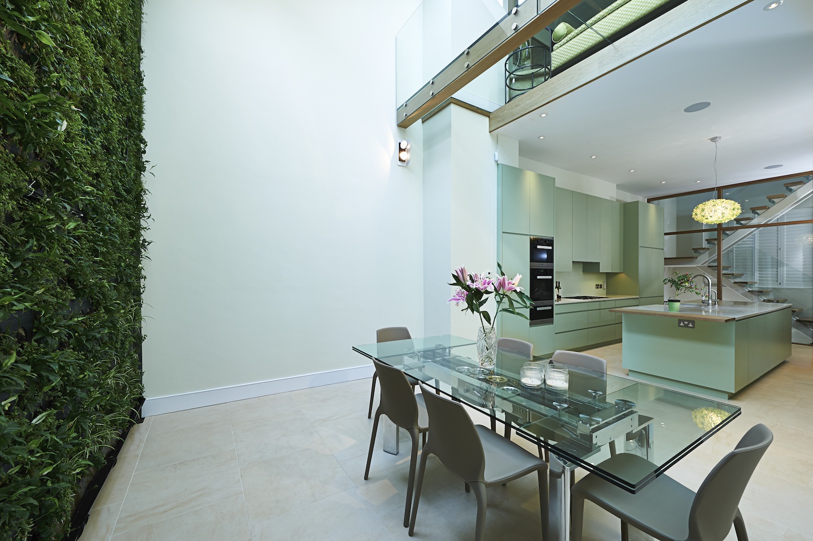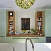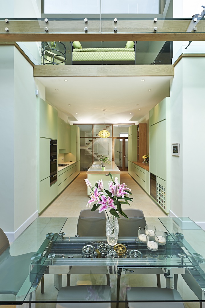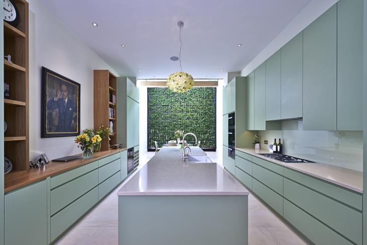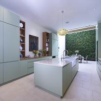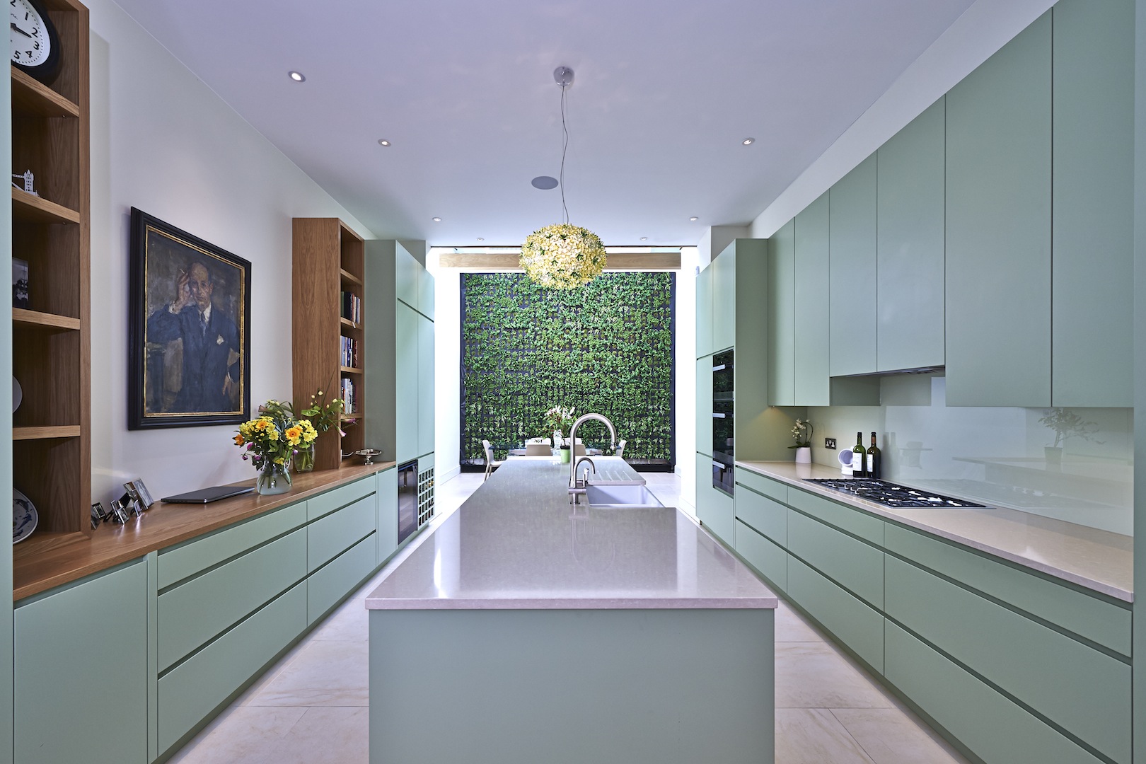 Interior and exterior in eggshell spray paint finish. Flat handleless doors with chamfered edges, belfast sink, Miele integrated appliances and White Organic composite stone worktop.