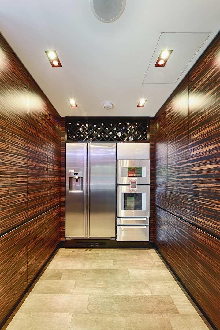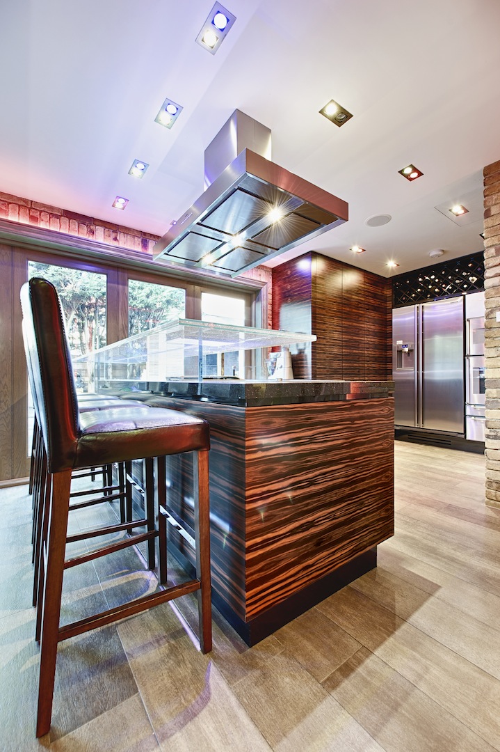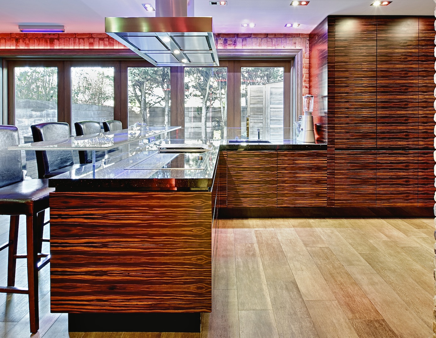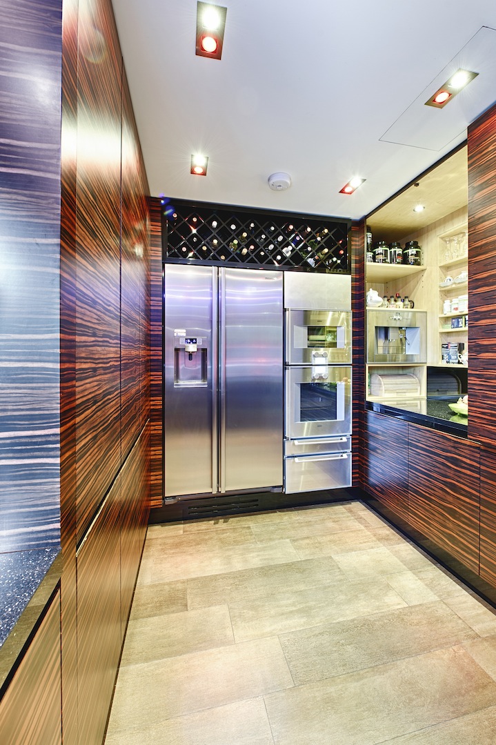 Interior made in solid hardwood maple lipped and veneer finish. Doors and panels in solid hardwood lipped natural ebony makassar with special care taken to horizontally match up veneer grains. Fitted Gaggenau appliances throughout, under mounted Blanco s/s sink and solid Galaxy Gold granite worktop with modern "glass effect" breakfast bar.