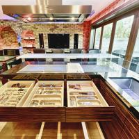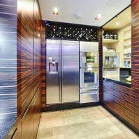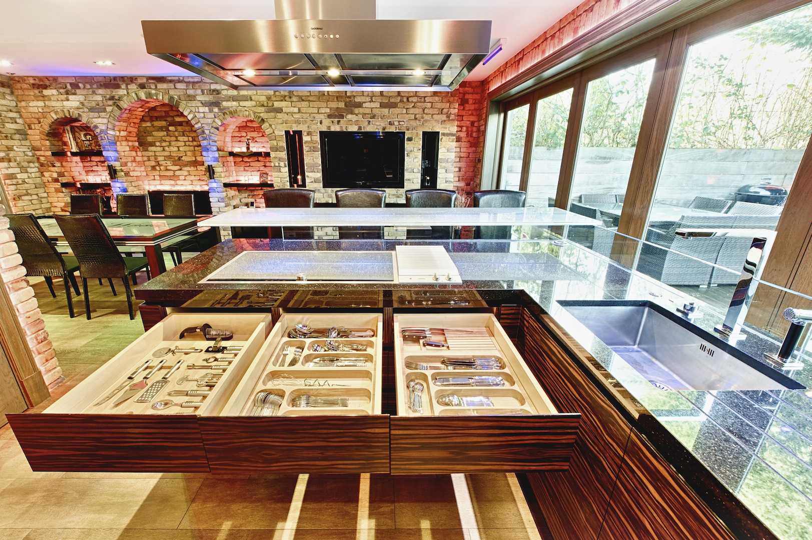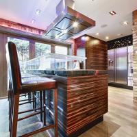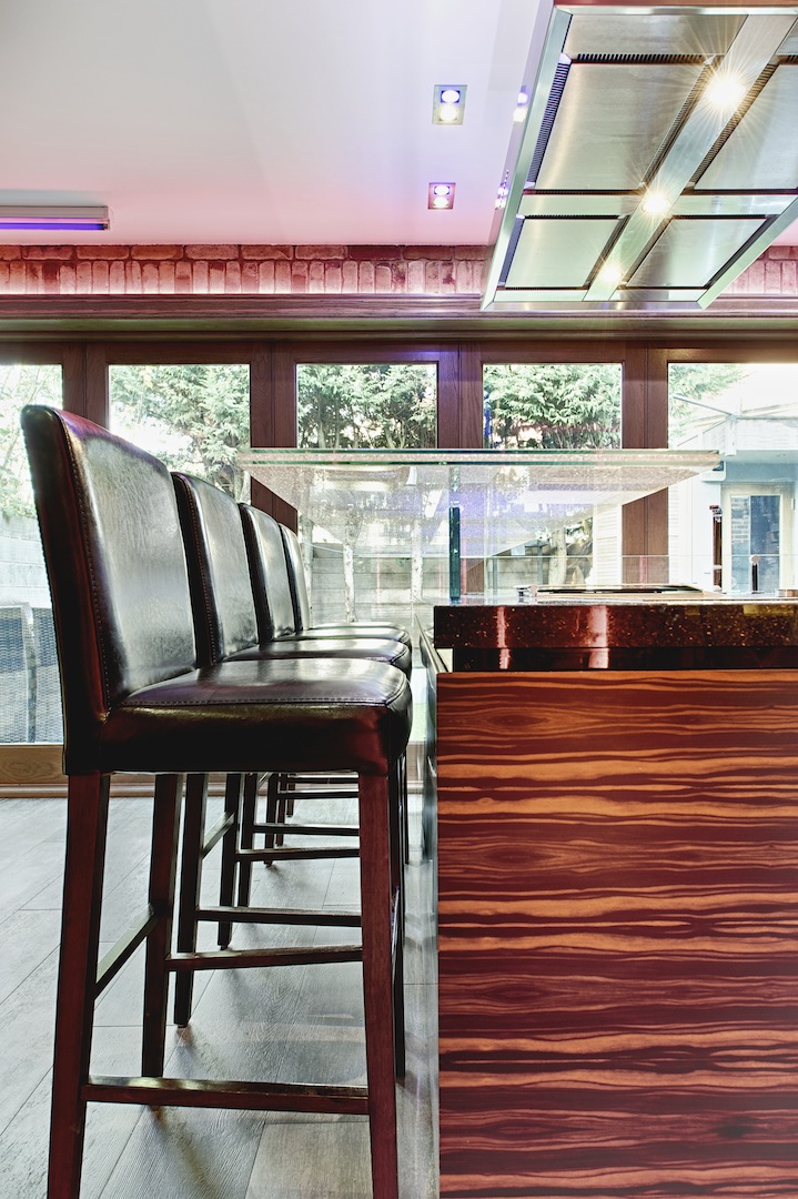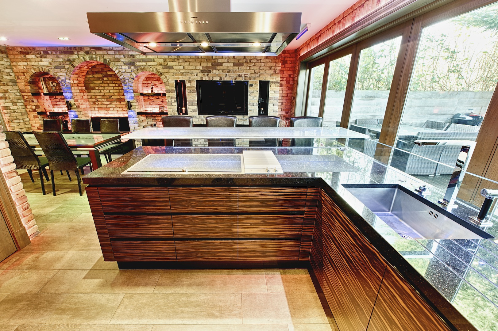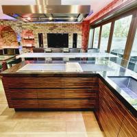 Interior made in solid hardwood maple lipped and veneer finish. Doors and panels in solid hardwood lipped natural ebony makassar with special care taken to horizontally match up veneer grains. Fitted Gaggenau appliances throughout, under mounted Blanco s/s sink and solid Galaxy Gold granite worktop with modern "glass effect" breakfast bar.