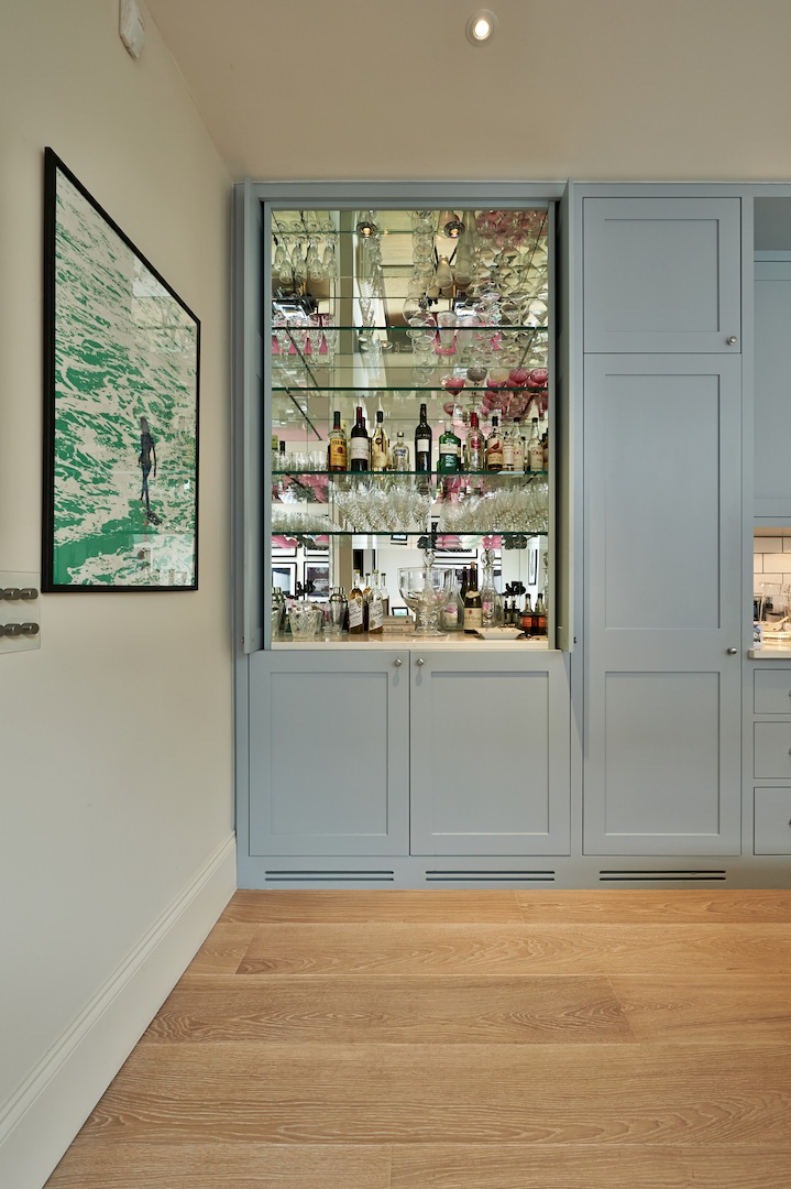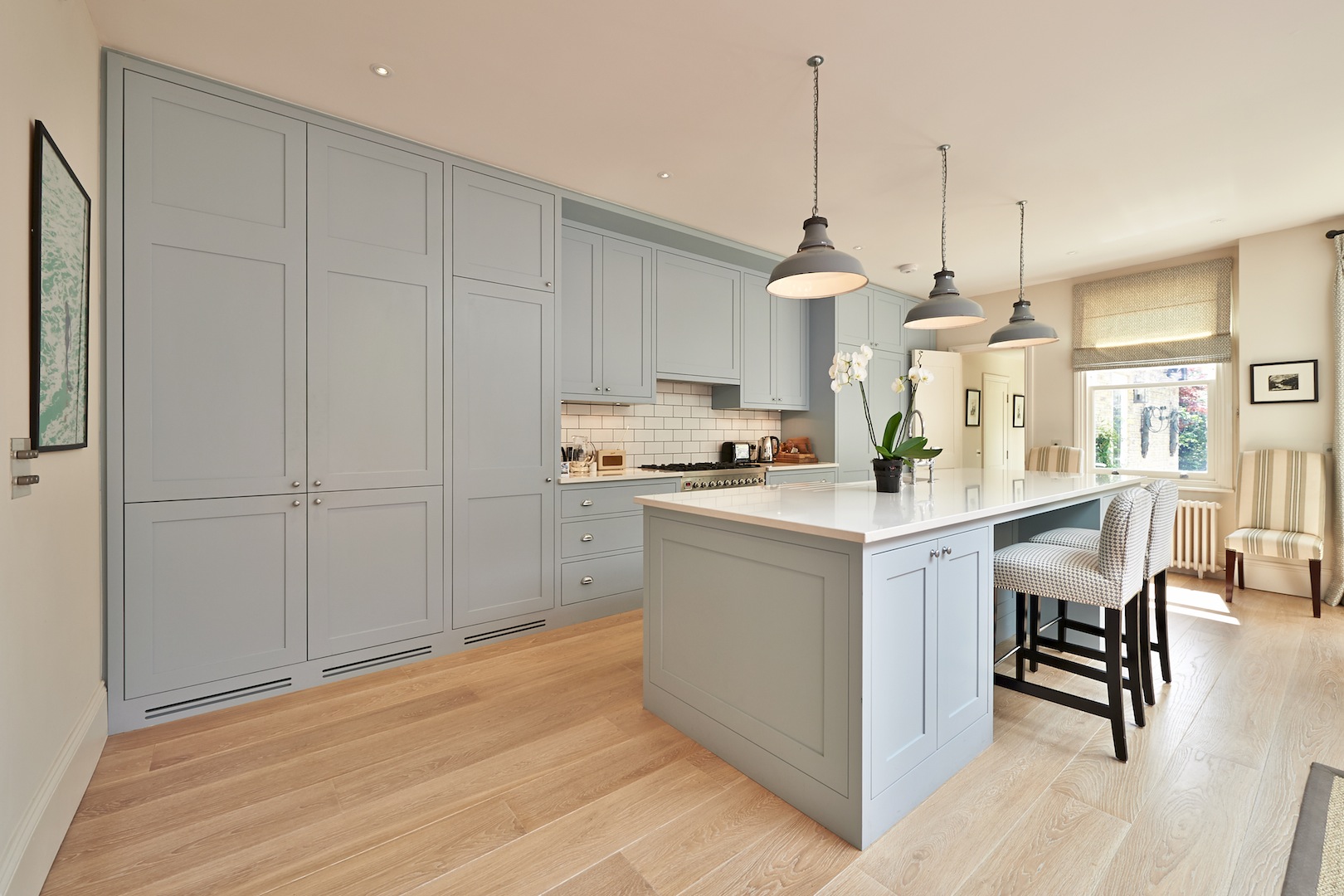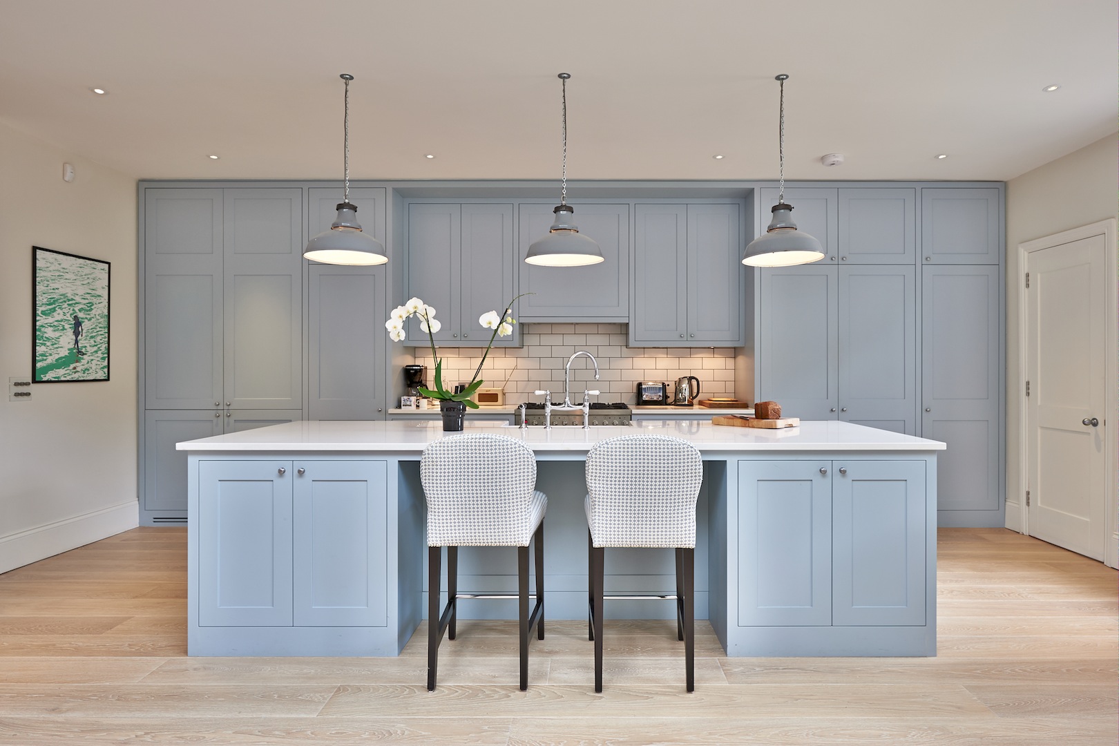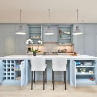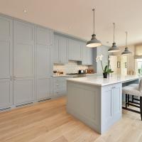 Interior and exterior cabinets and doors lipped with hardwood and hand painted in a matt finish. Shaker style doors with flat panels, free range cooker, belfast sink, side bar unit and Ceasarstone 4600 Organic White honed worktop.