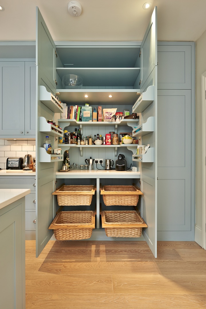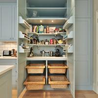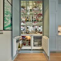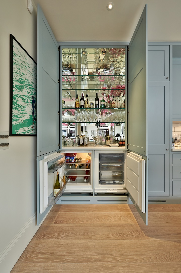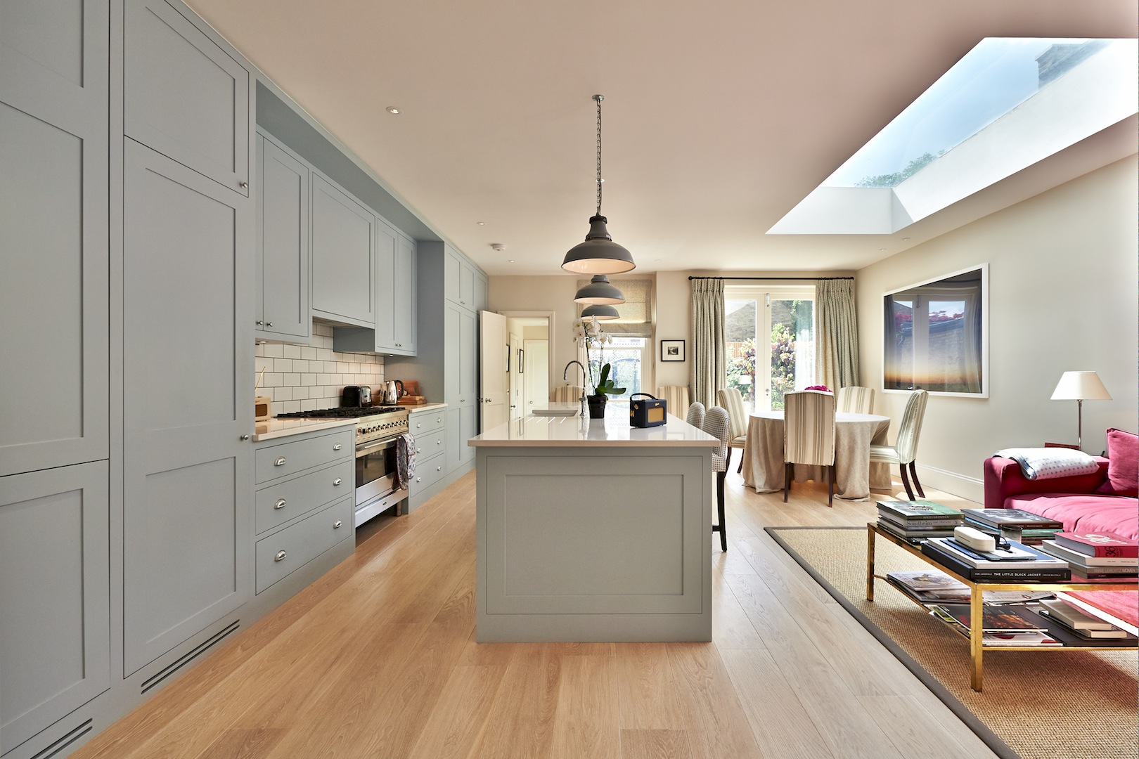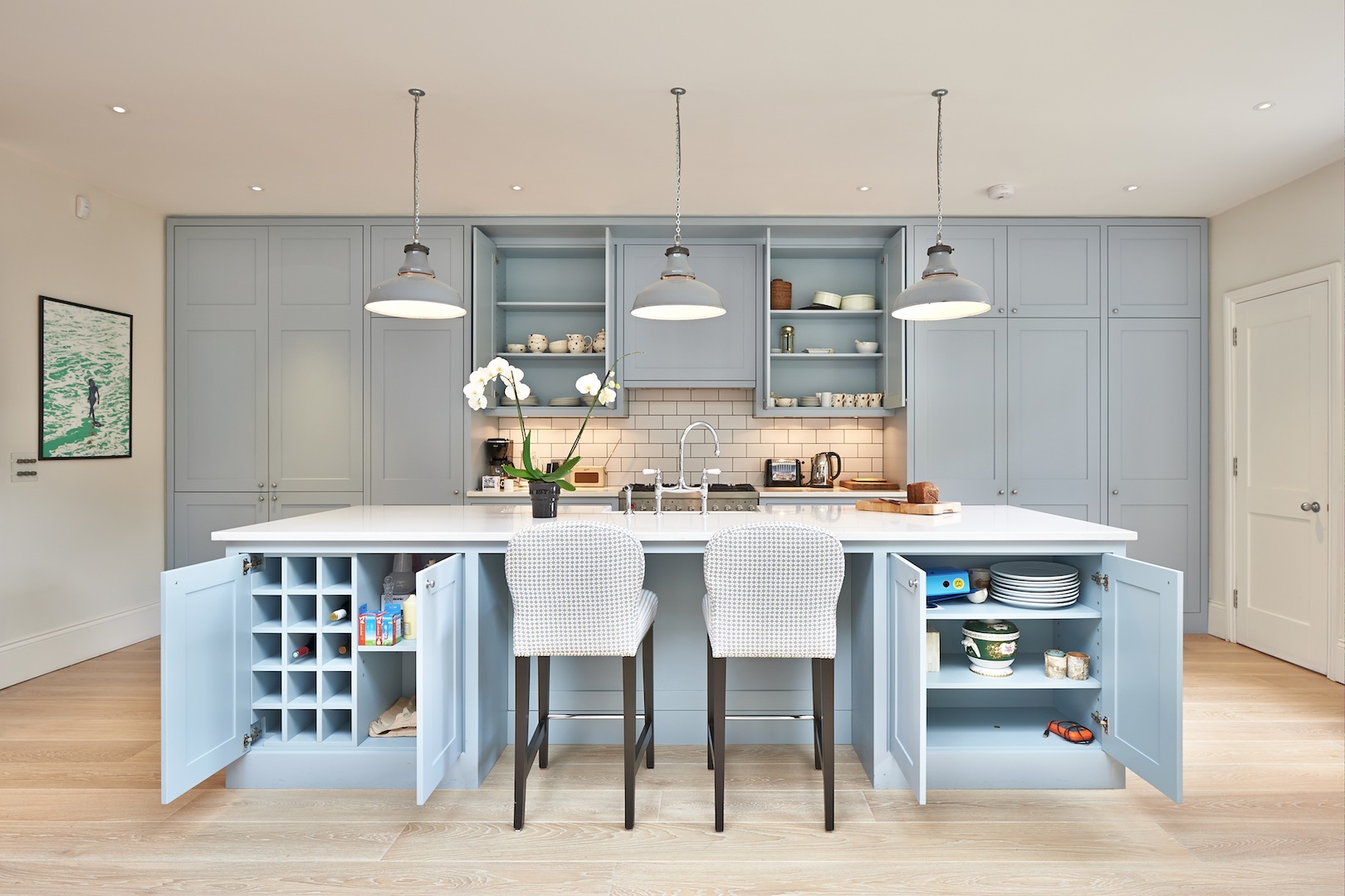 Interior and exterior cabinets and doors lipped with hardwood and hand painted in a matt finish. Shaker style doors with flat panels, free range cooker, belfast sink, side bar unit and Ceasarstone 4600 Organic White honed worktop.
