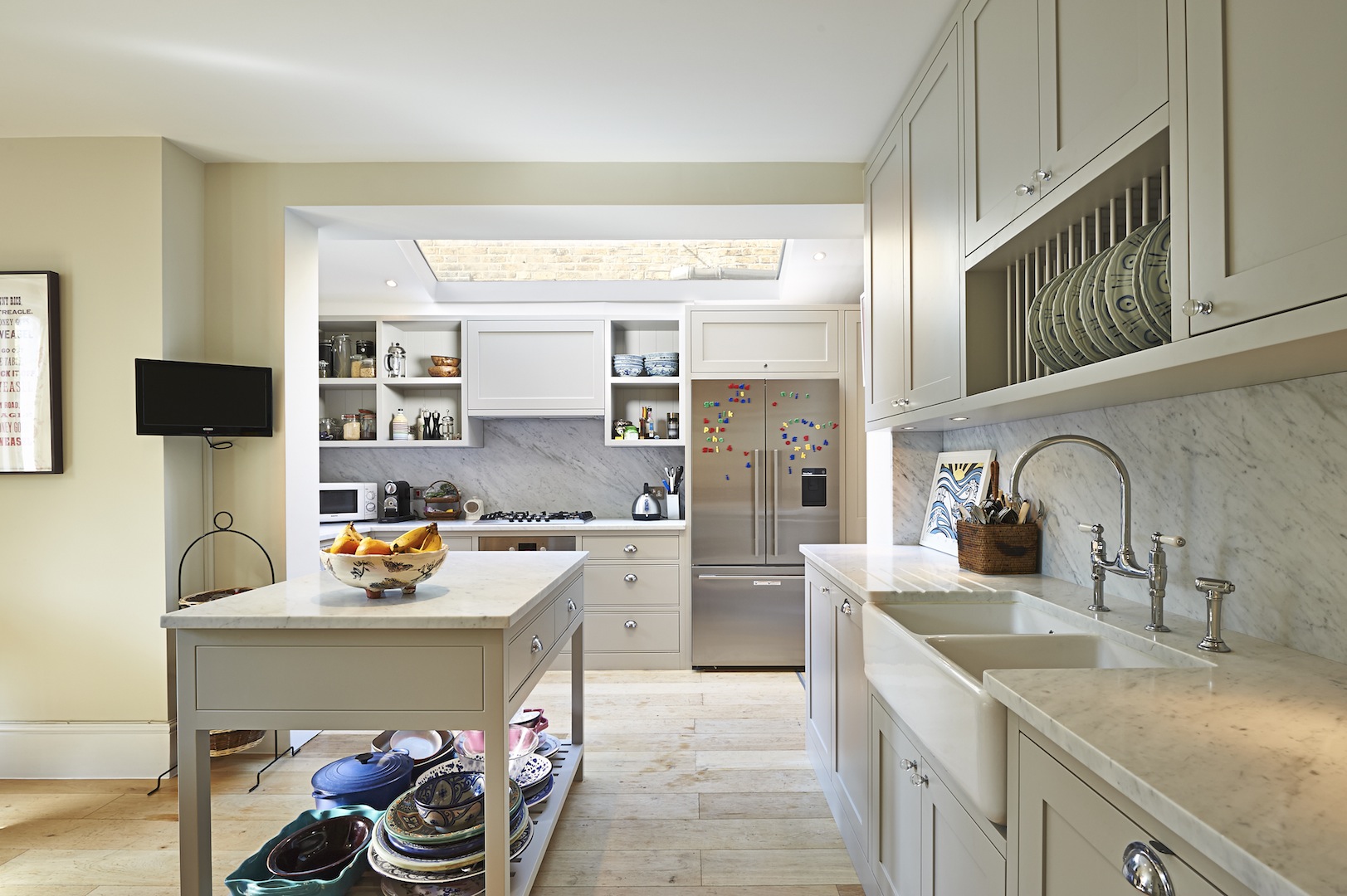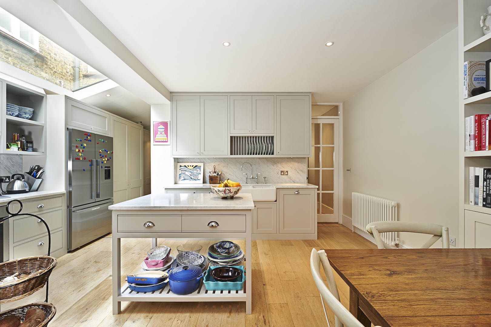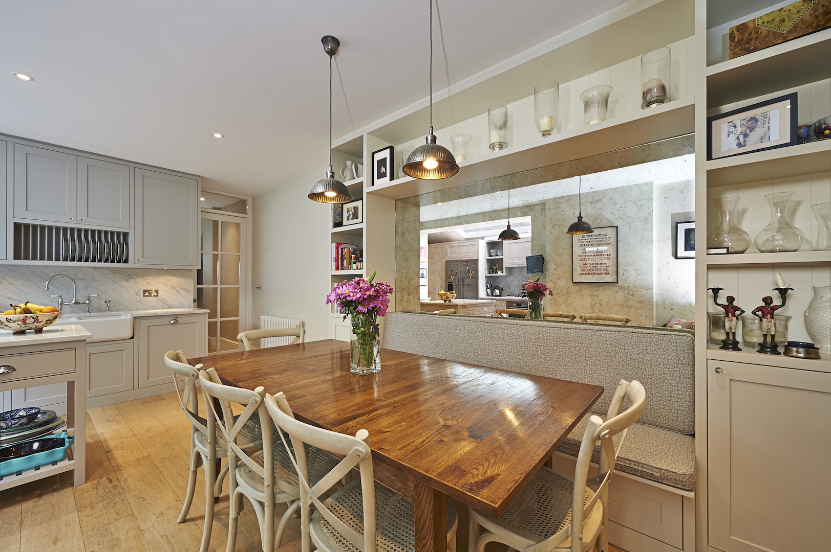Interior and exterior cabinets and doors lipped with hardwood in a matt spray painted finish. Shaker style doors, belfast sink and Carrera marble honed worktop. Banquette with tailored cushion and venetian antique mirror above.