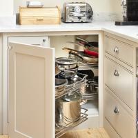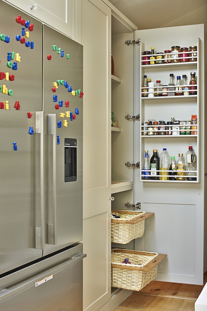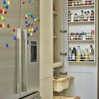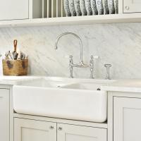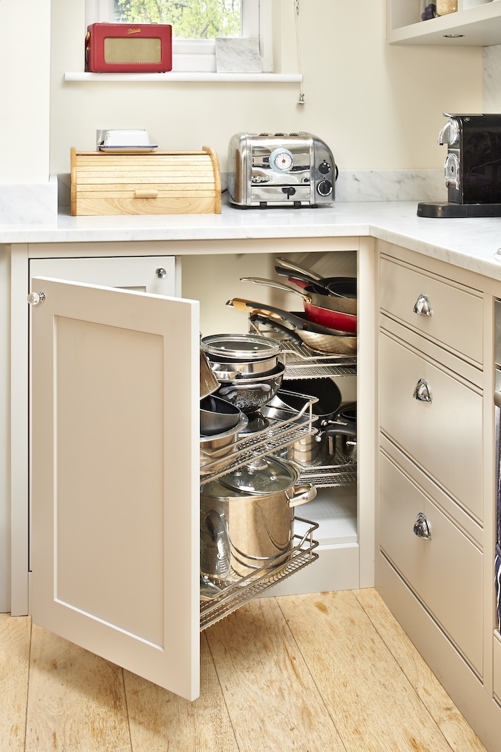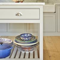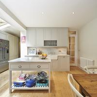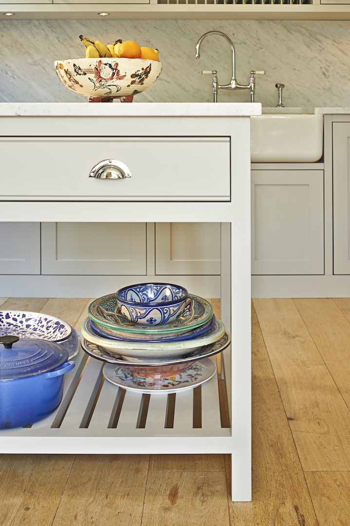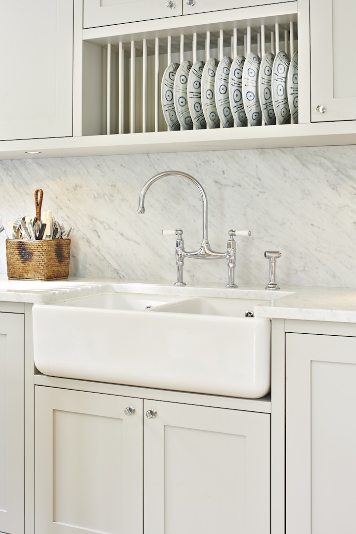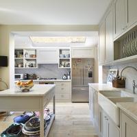 Interior and exterior cabinets and doors lipped with hardwood in a matt spray painted finish. Shaker style doors, belfast sink and Carrera marble honed worktop. Banquette with tailored cushion and venetian antique mirror above.