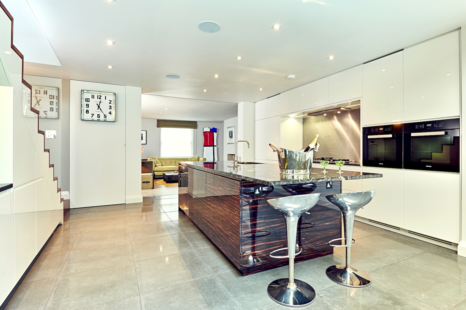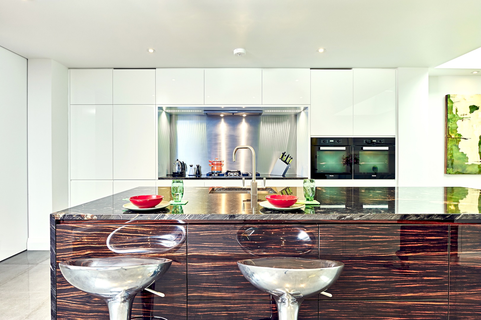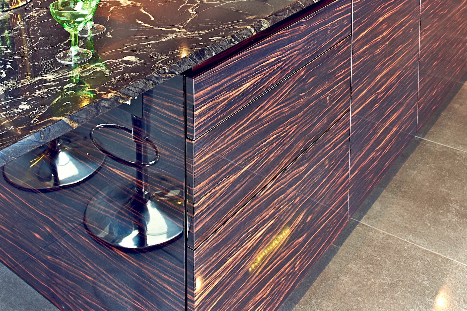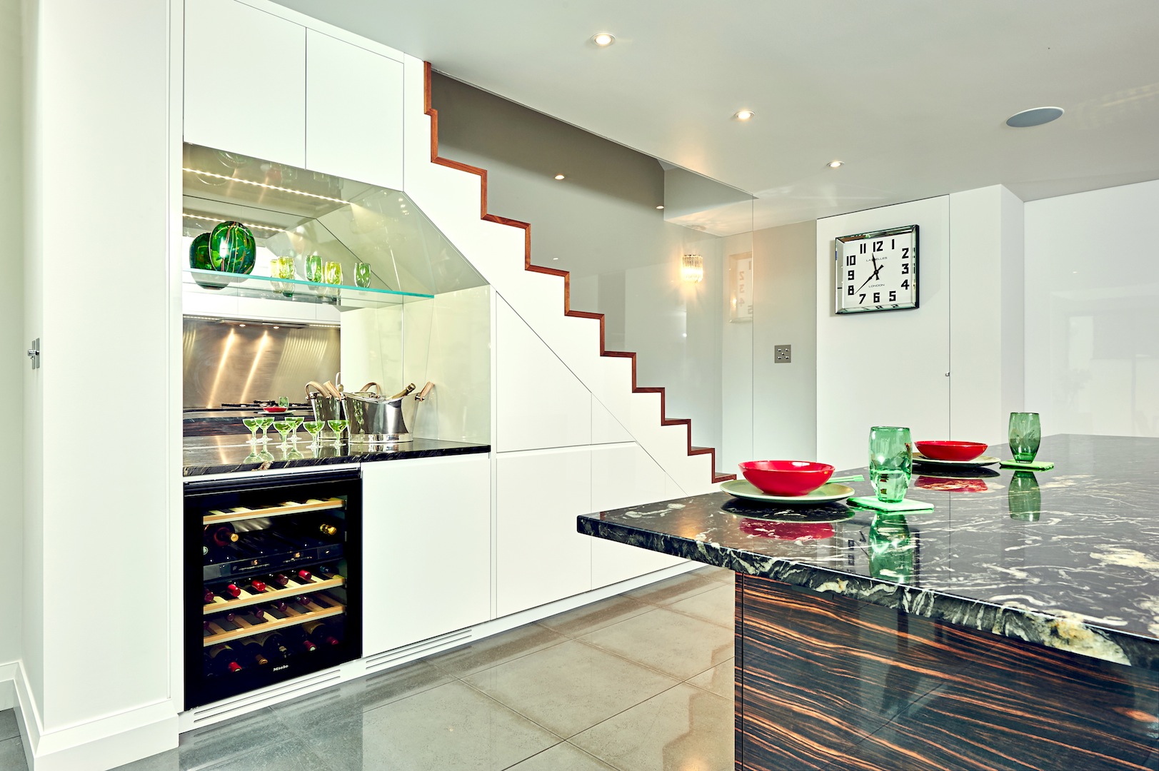 Kitchen cupboards in polish gloss spray paint finish throughout. Island doors and panels in solid hardwood lipped natural ebony makassar with special care taken to horizontally match up veneer grains. Under stairs units contain bar with wine fridge.