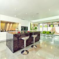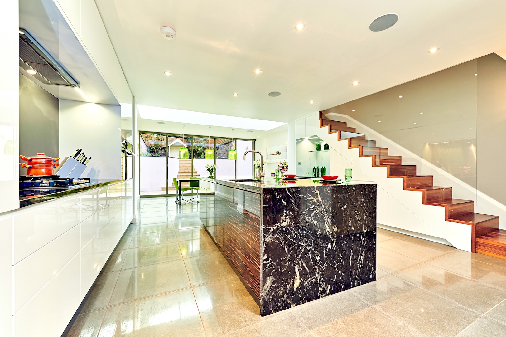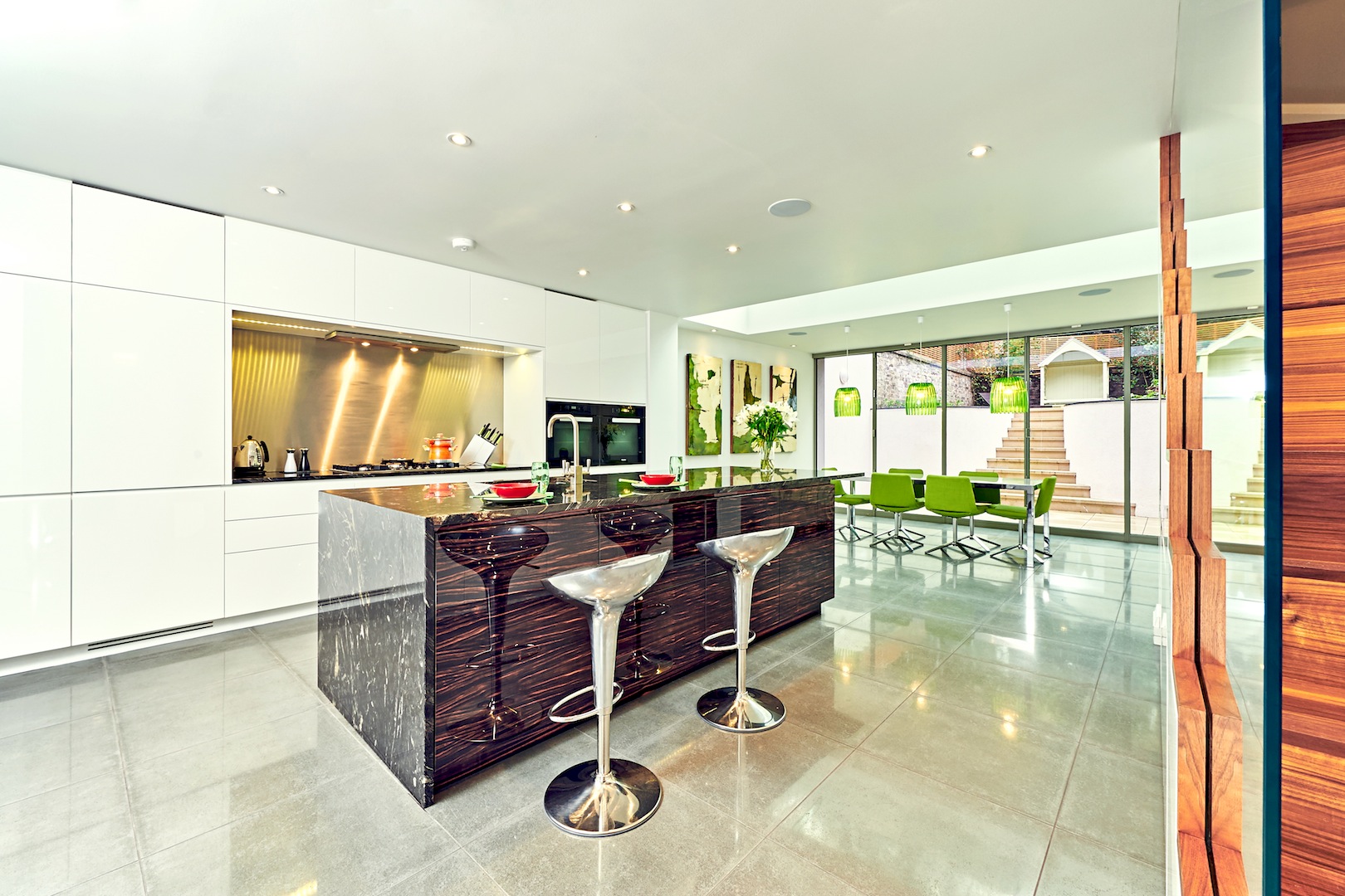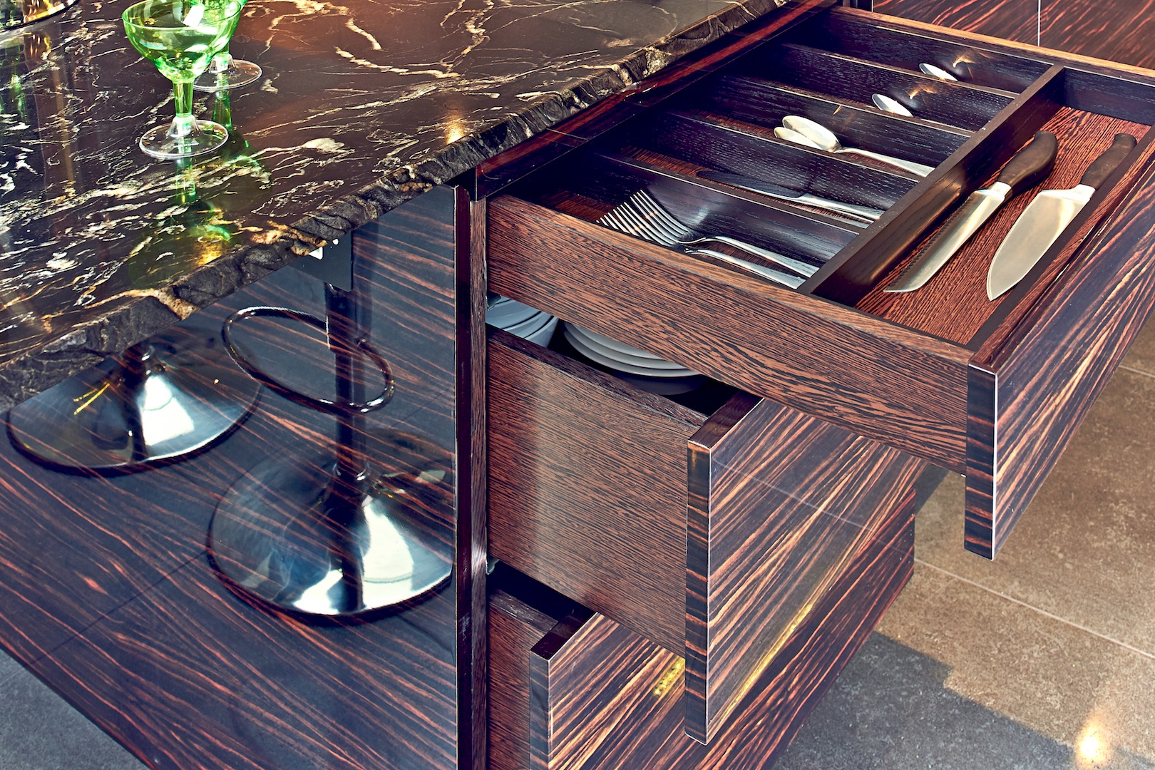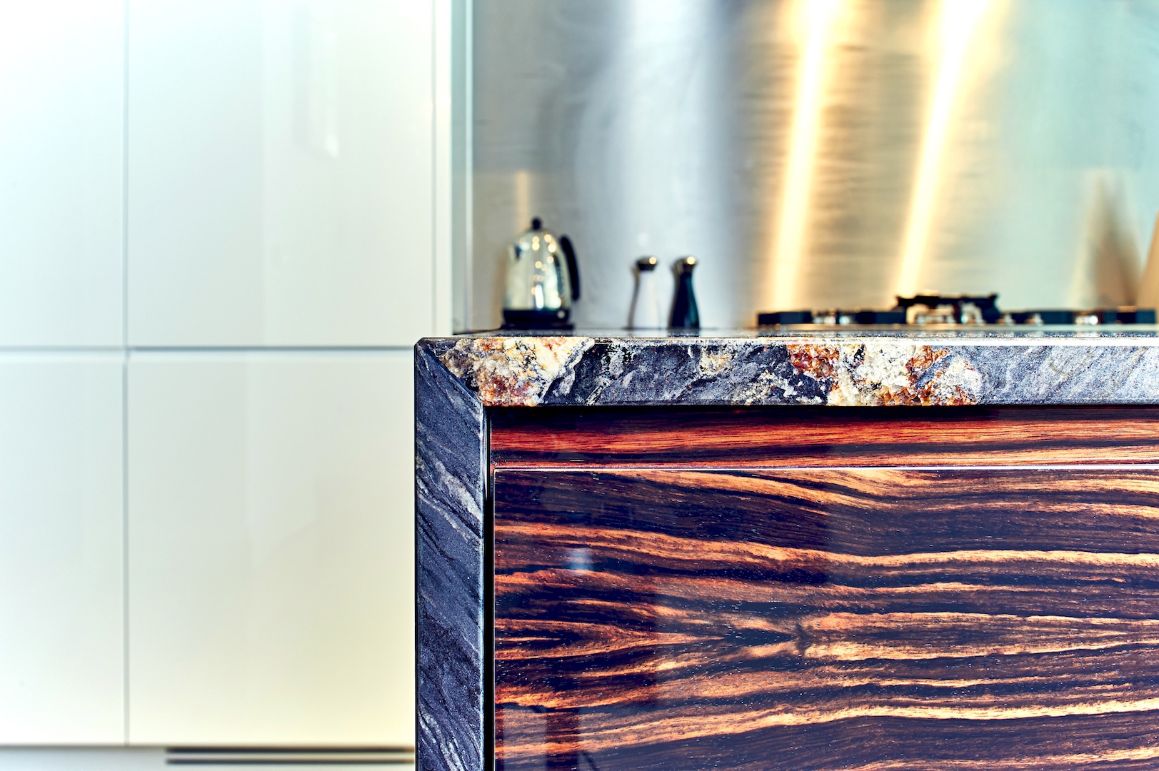 Kitchen cupboards in polish gloss spray paint finish throughout. Island doors and panels in solid hardwood lipped natural ebony makassar with special care taken to horizontally match up veneer grains. Under stairs units contain bar with wine fridge.