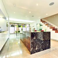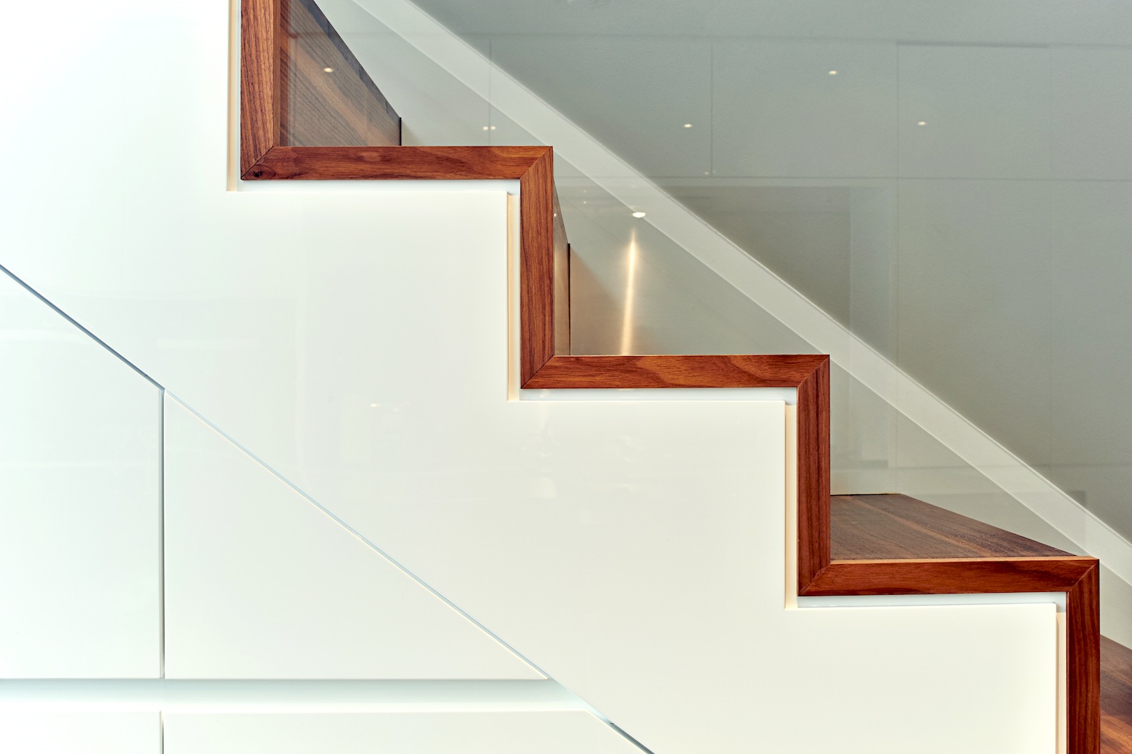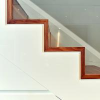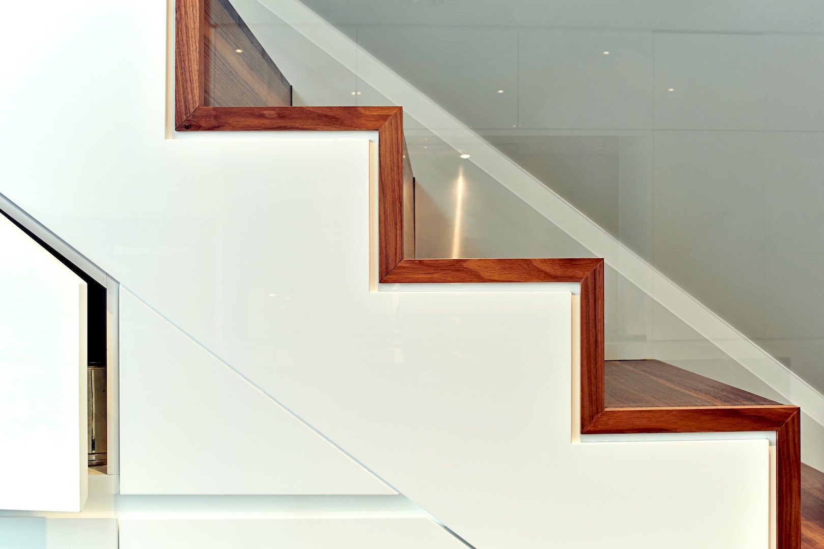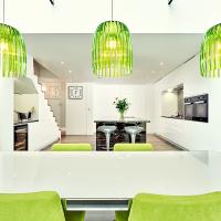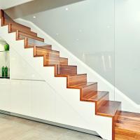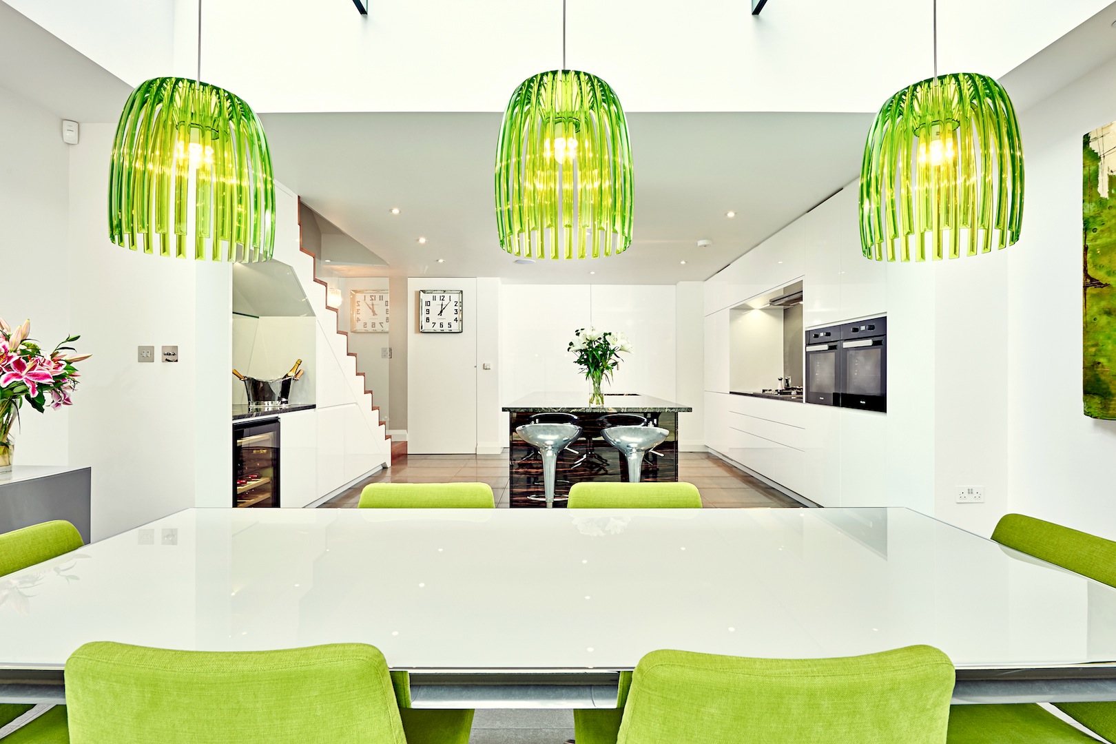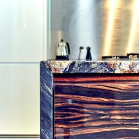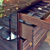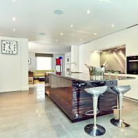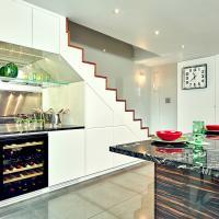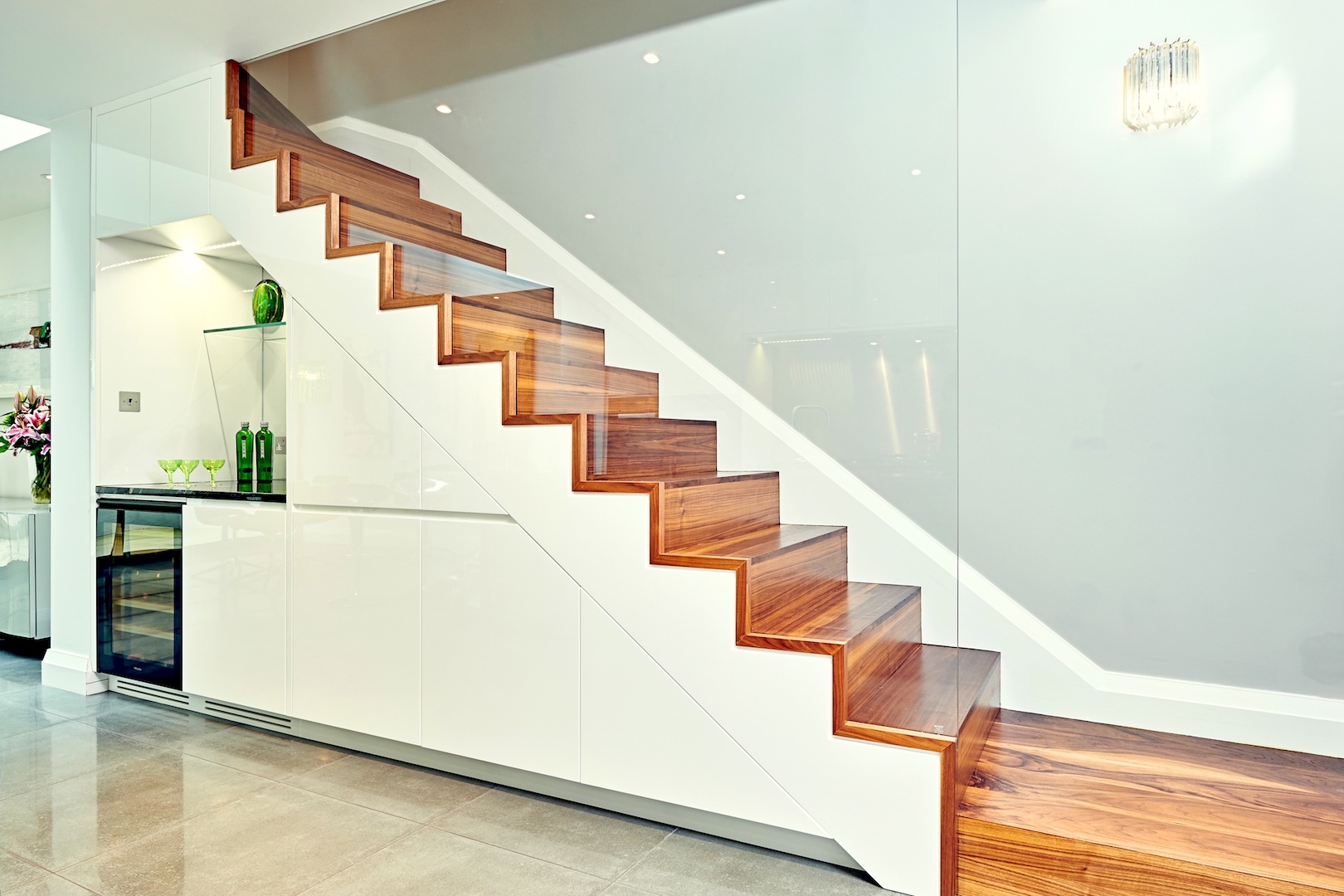 Kitchen cupboards in polish gloss spray paint finish throughout. Island doors and panels in solid hardwood lipped natural ebony makassar with special care taken to horizontally match up veneer grains. Under stairs units contain bar with wine fridge.
